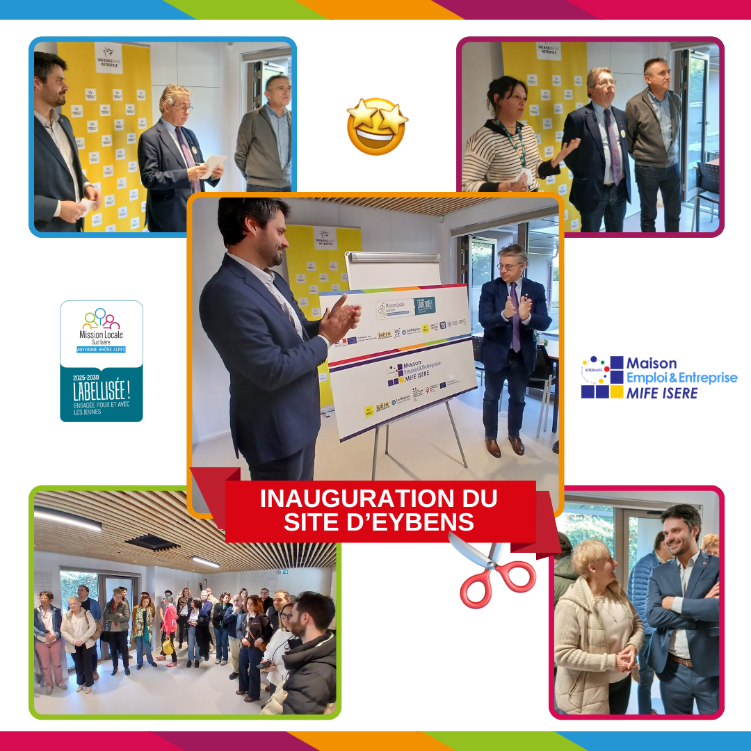 Christophe Ferrari (Président de Grenoble Alpes Métropole), Philippe Paliard (Élu de la Région Auvergne-Rhône-Alpes), Nicolas Richard (Maire d’Eybens), Marie Rueda et Dominique Scheiblin (Vice-présidentes de la MLSI), Christelle CHAVAND (Élue d’Eybens), Salomé DURAND (Chargée d’Opération bâtiment – Service Construction à la Métropole de Grenoble), Karine Troussier-Duret (Directrice de la MEE – MIFE Isère), Stéphanie Scherer (Directrice adjointe de la MEE – MIFE Isère), Rabah FEKIH (Responsable de l’Unité Partenariale à la MLSI), Bruce Malleval (Directeur de la MLSI), les salariés de la MEE – MIFE Isère et de la Mission Locale Sud Isère ainsi que les techniciens de la Métropole de Grenoble étaient présents pour participer et animer cette Inauguration mais aussi dévoiler la Banderole « Mission Locale Sud Isère et Maison Emploi & Entreprise – MIFE Isère » qui lance officiellement l’ouverture du site 🤩